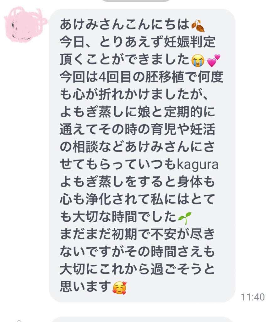 不妊治療で病院に通いながらよもぎ蒸しを続けていただいたお客様です。
